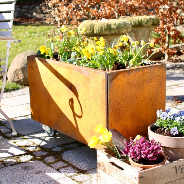 Blomlådor av cortenstål är ett unikt och iögonfallande tillskott till alla trädgårdar